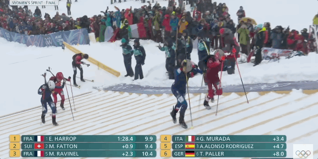 世锦赛三冠王、身穿蓝衣头戴灰粉色头盔法国名将埃米莉·哈罗普无疑是女子短距离比赛的夺冠最大热门,第一赛段和第二赛段的配速都遥遥领先,但是在转换区穿板时她出现了明显失误,被瑞士选手、世锦赛双冠王,身穿红衣脚踩黄色雪板的玛利亚内-法顿超越。