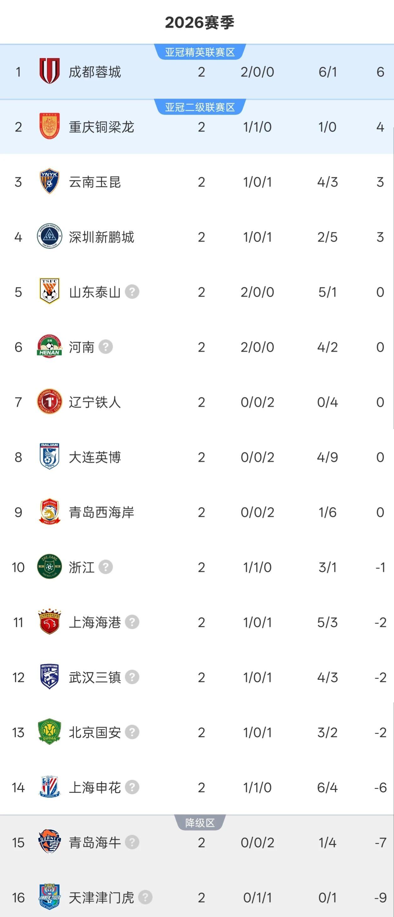 北京时间3月15日,随着第三个比赛日3场比赛顺利进行,2026赛季中超联赛第2轮比赛全部结束。2轮过后的积分榜,3支球队夺得2连胜,成都蓉城6分继续领跑,2支球队完成“负分清零”,另有4队有望下轮实现积分转正。