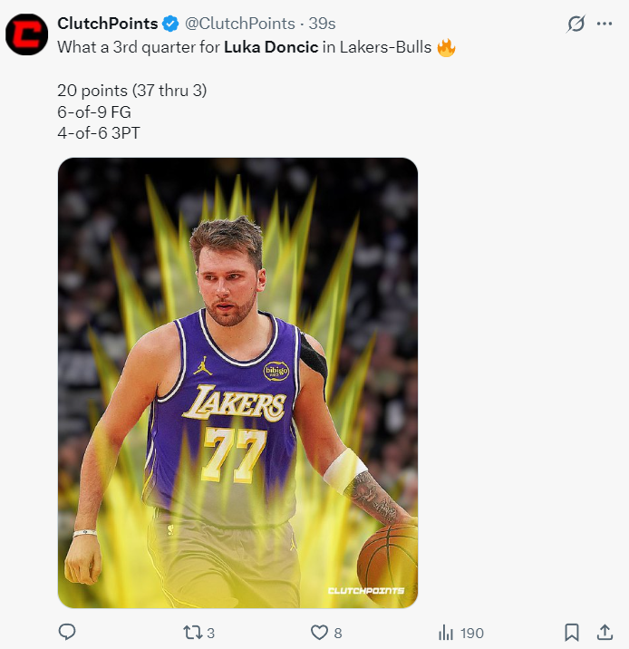 第三节湖三崩虽迟但到,湖人上半场一度领先到20分,第三节直接被缩小到3分,全队全靠东契奇一人去拿分,东契奇连续三个三分球为湖人续命,东契奇9分钟里连拿16分帮助湖人再度领先到9分,单节东契奇9中6+三分6中4拿到20分3篮板2助攻,三节37分10助攻大号两双。